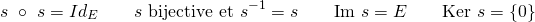 \[ \qquad s \ \circ \ s = Id_E \qquad s \text{ bijective et } s^{-1} = s \qquad \text{Im } s = E \qquad \text{Ker } s = \{0\} \]
