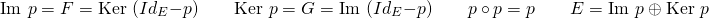 \[ \text{Im } p = F = \text{Ker } (Id_E - p) \qquad \text{Ker } p = G = \text{Im } (Id_E - p) \qquad p \ \circ \ p = p \qquad E = \text{Im } p \ \oplus \ \text{Ker } p \]